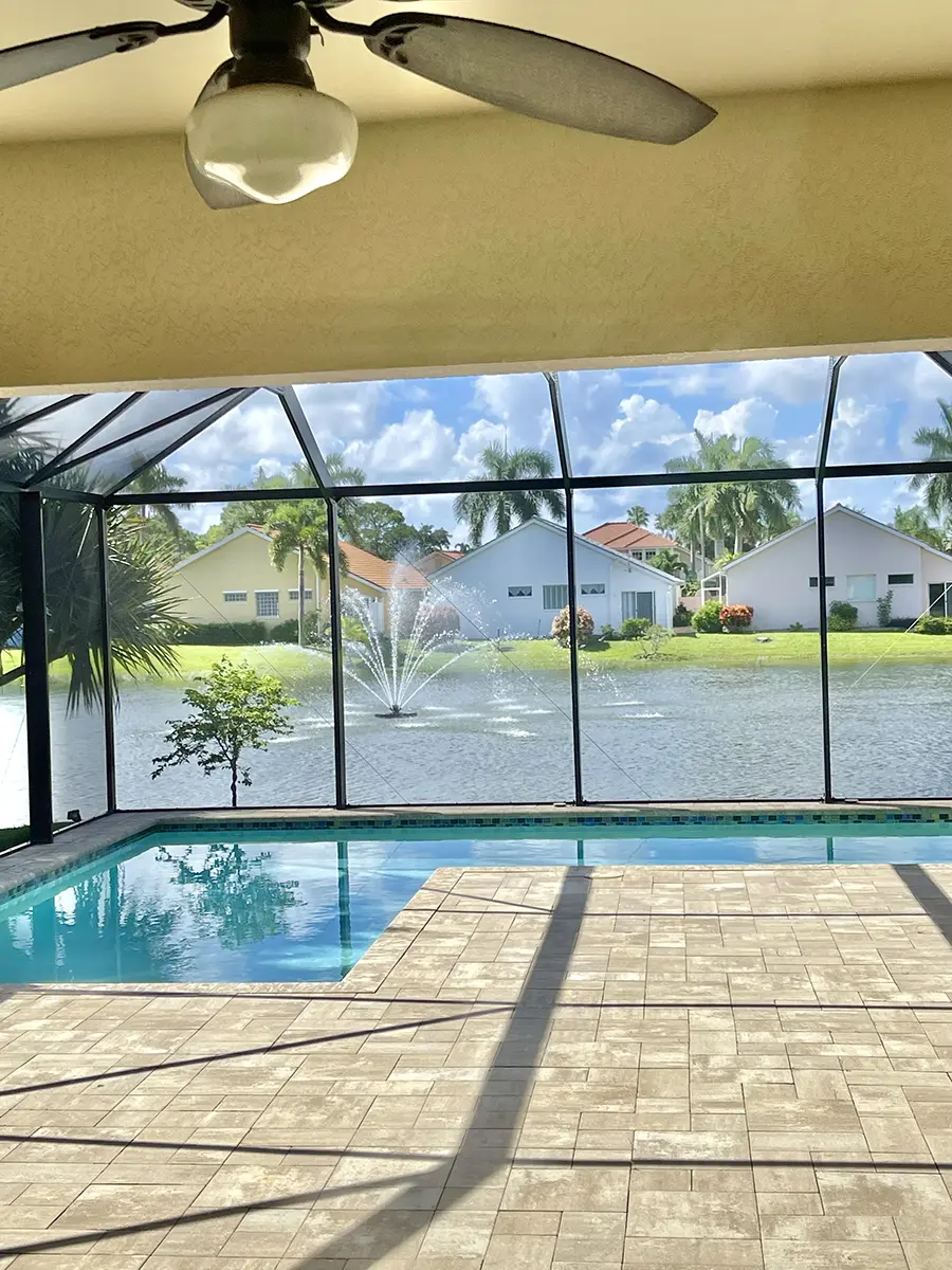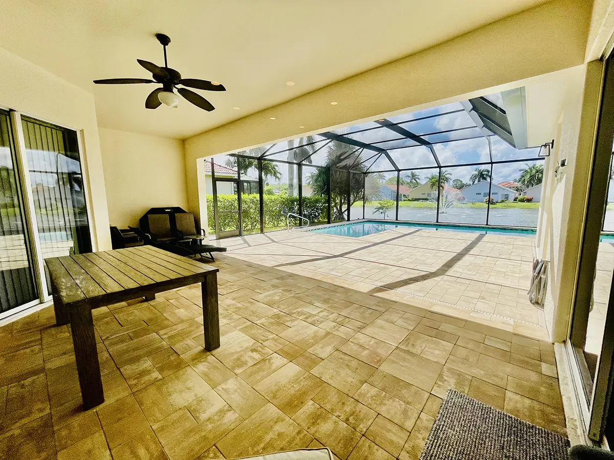 The south-facing screened pool deck with fountain views enjoys maximum afternoon sun. Relax on the loungers, fire up the BBQ, or swim year-round with the pool heater (available for a daily fee). Garage and additional driveway parking are included.