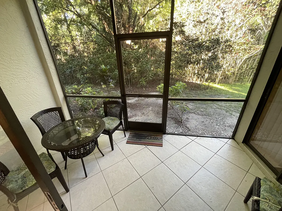 The west-facing screened lanai overlooks a peaceful, lush preserve and provides direct access to scenic walking and biking trails within the beautifully maintained tropical community.