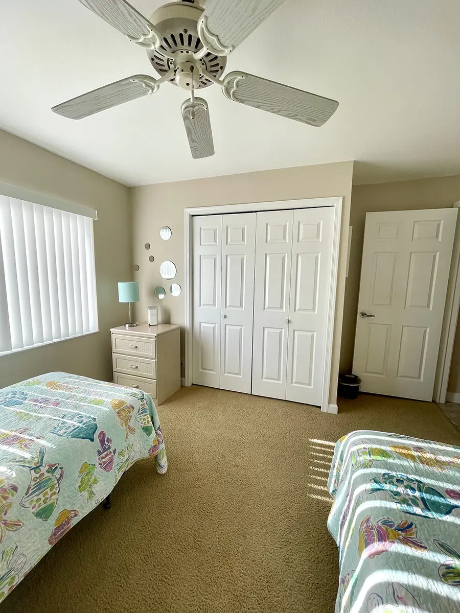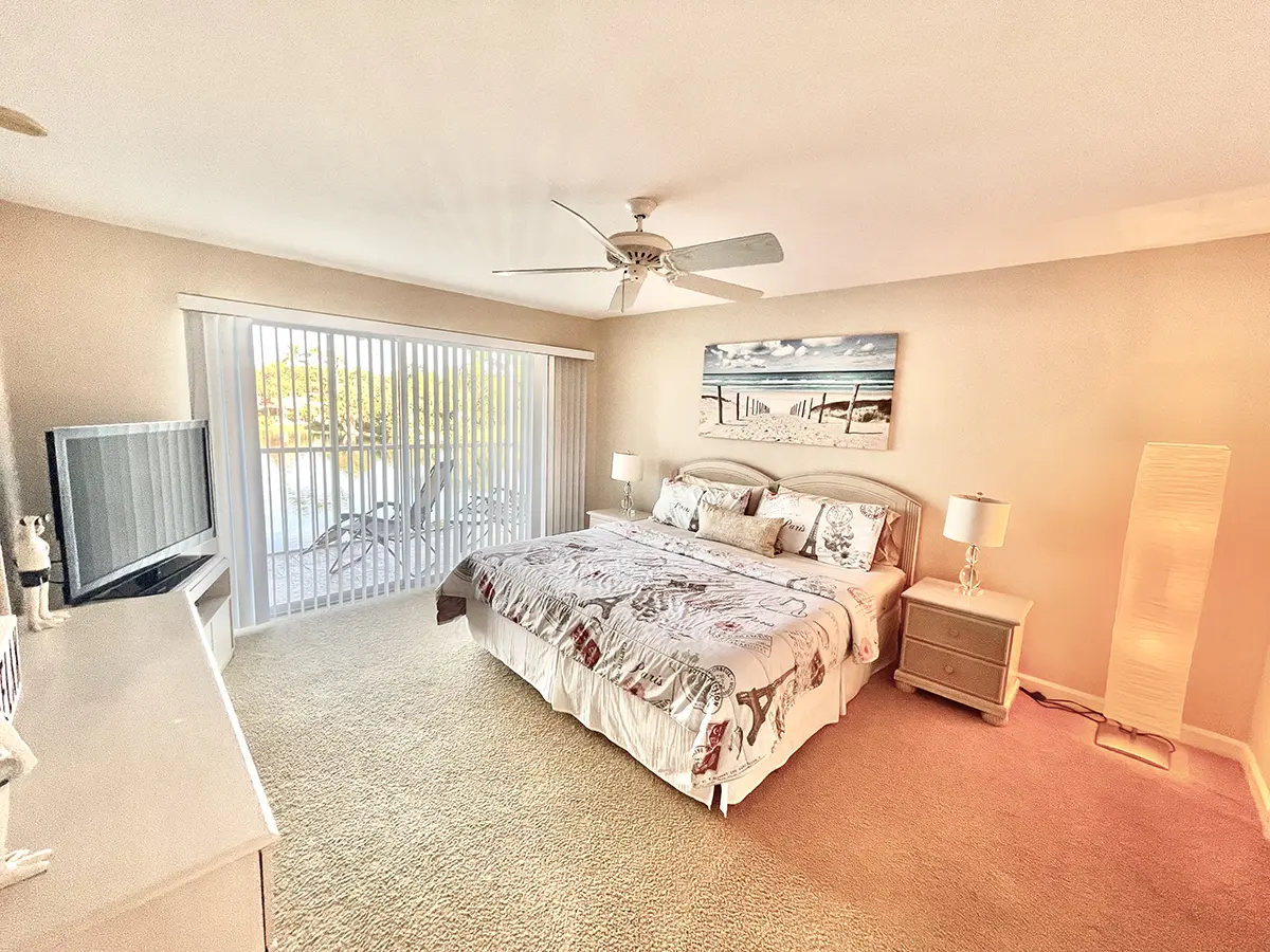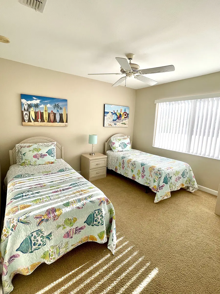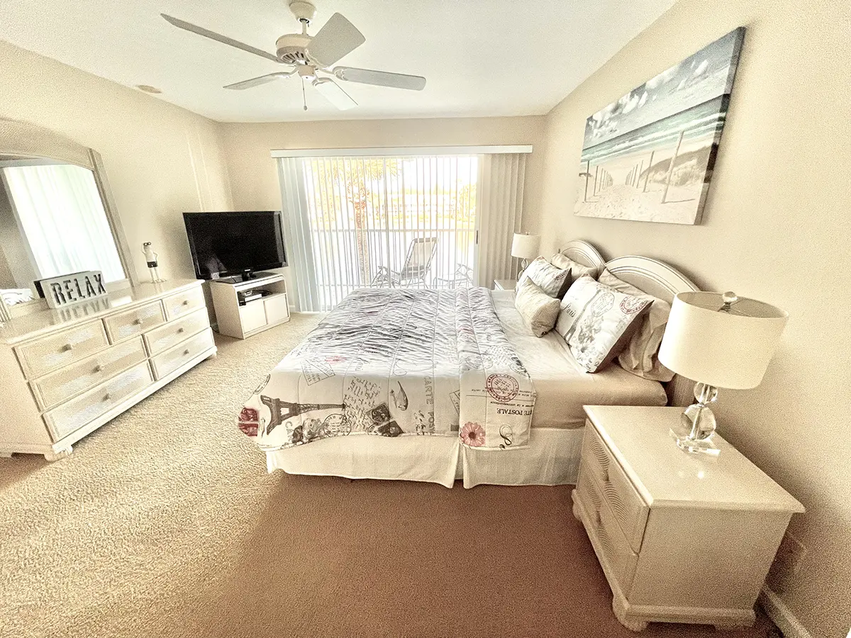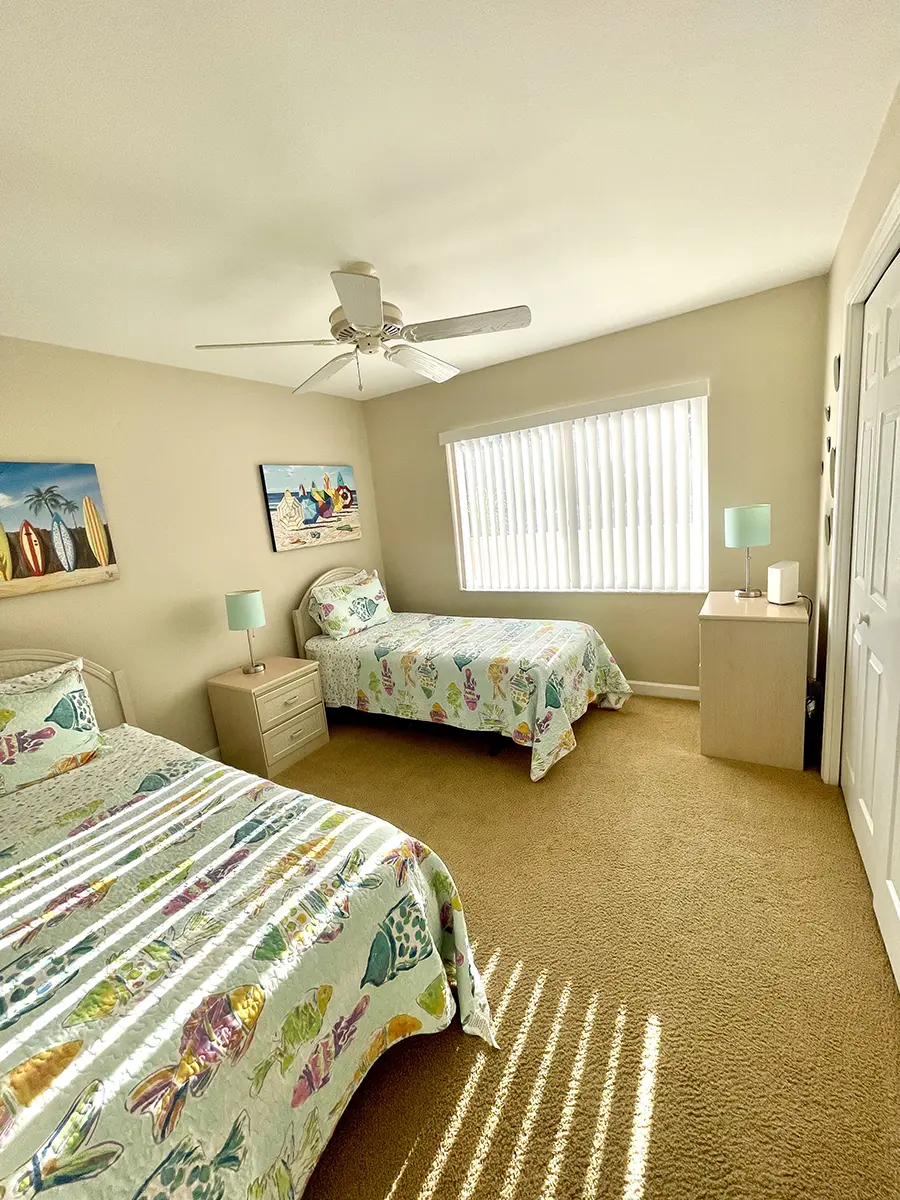 The master suite features a king-size bed, en-suite bathroom, walk-in closet, and access to the rear lanai for ultimate relaxation. The guest bedroom has two twin beds with an adjacent bathroom, perfect for family or friends. High ceilings and an open-concept layout make the condo feel bright and airy, flowing seamlessly from the fully equipped kitchen to the dining and living areas and out to the lanais.