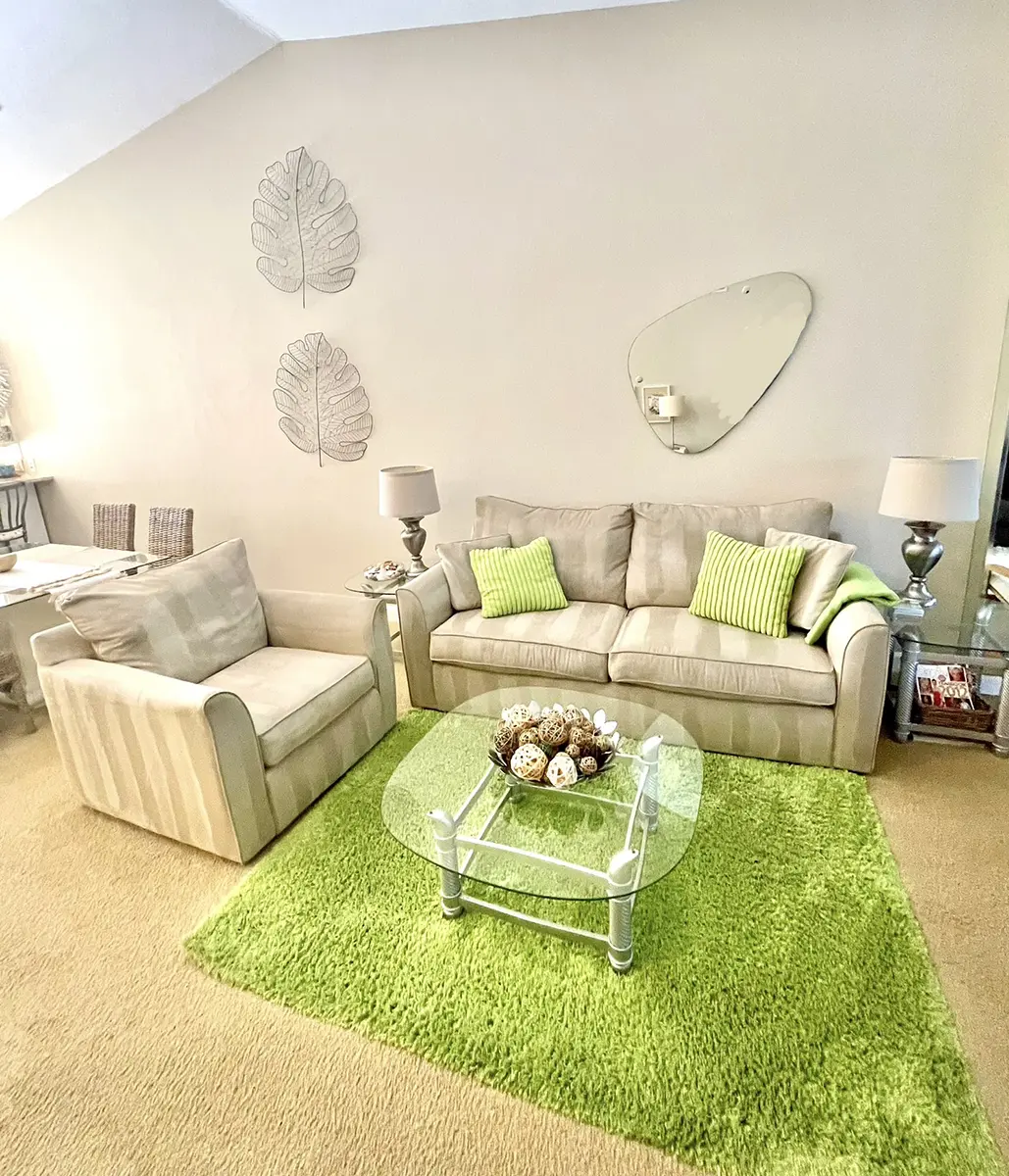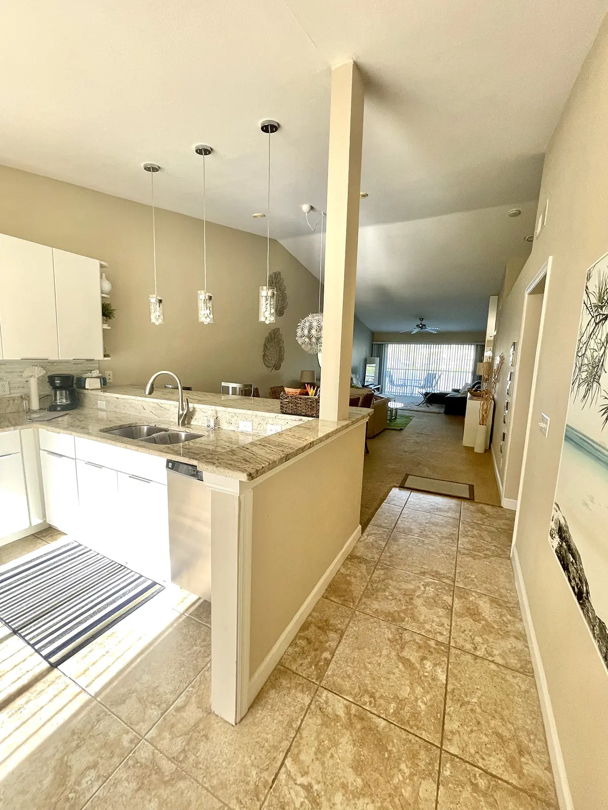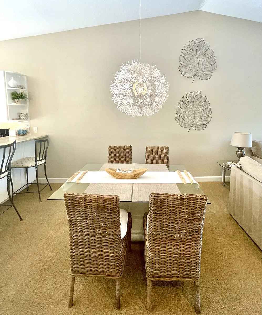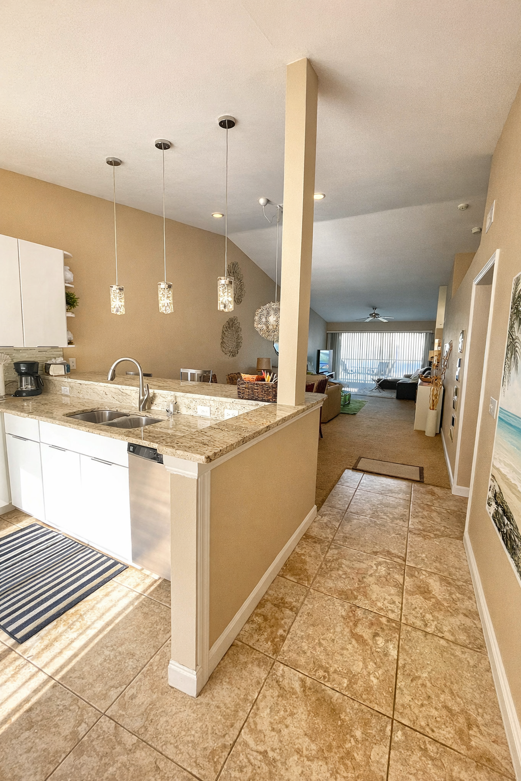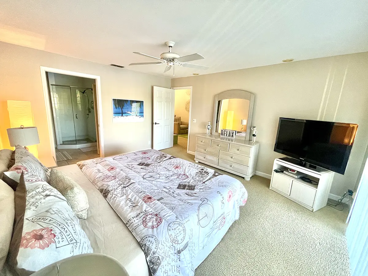 The master suite features a king-size bed, en-suite bathroom, walk-in closet, and access to the rear lanai for ultimate relaxation. The guest bedroom has two twin beds with an adjacent bathroom, perfect for family or friends. High ceilings and an open-concept layout make the condo feel bright and airy, flowing seamlessly from the fully equipped kitchen to the dining and living areas and out to the lanais.