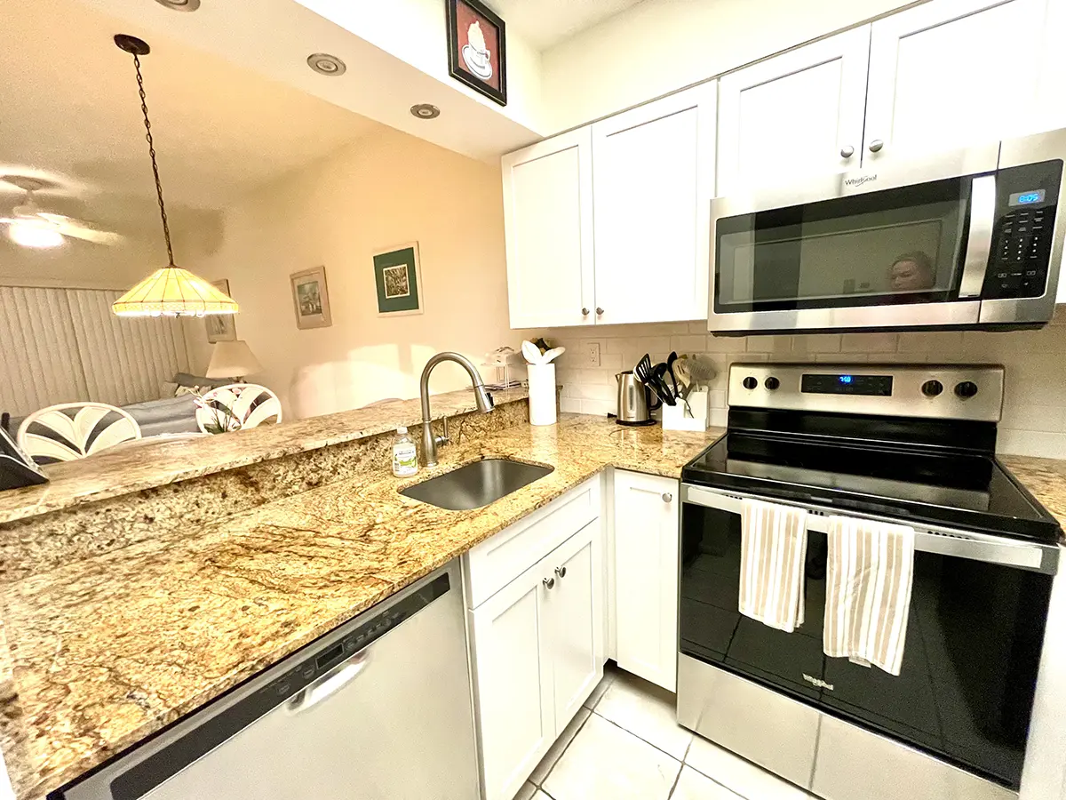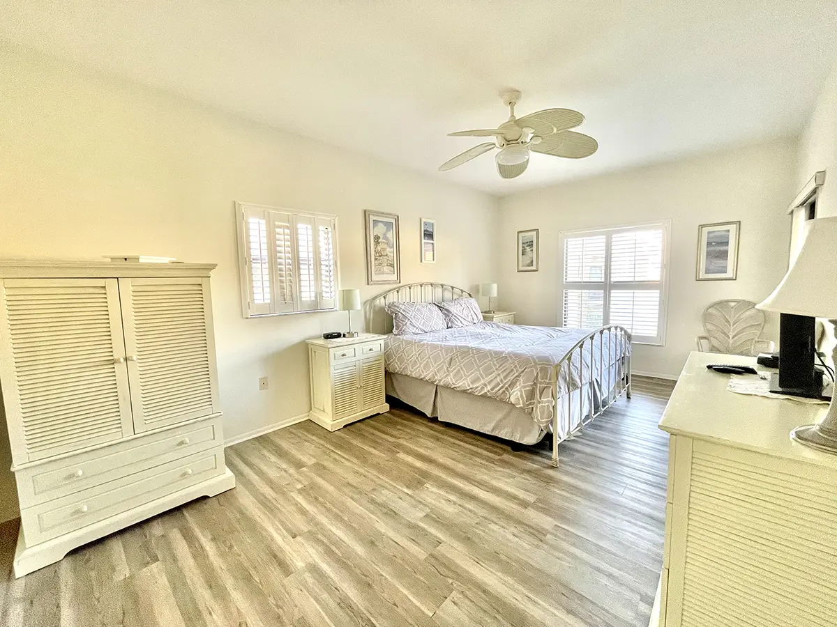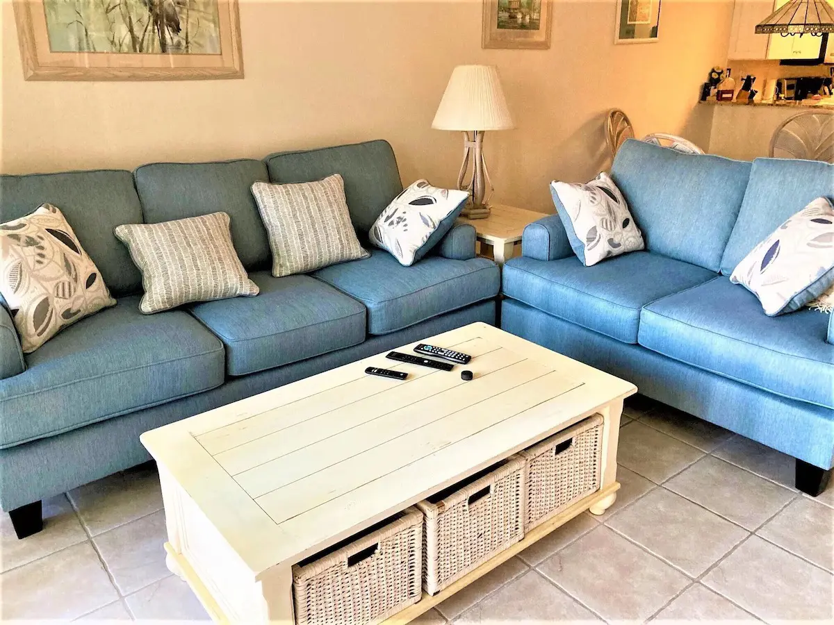 The master suite features a king-size bed, flat-screen TV, and en suite bathroom, while the guest bedroom has two twin beds and an adjacent bath. Cook in the modern kitchen or relax in the open-concept living area with stylish coastal furnishings.