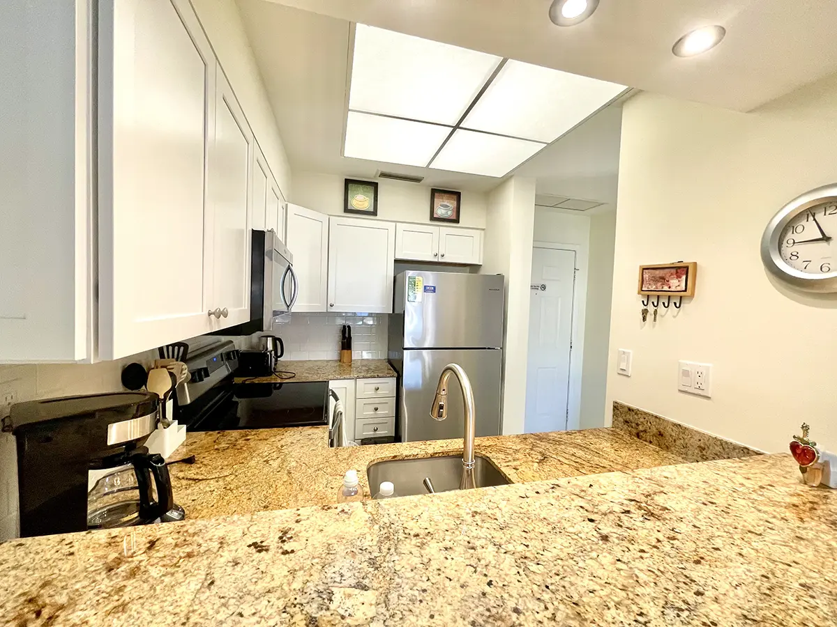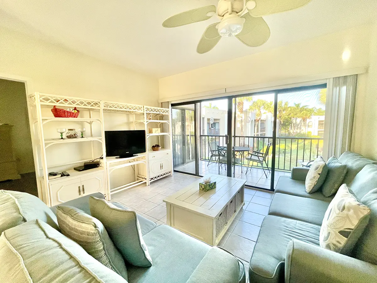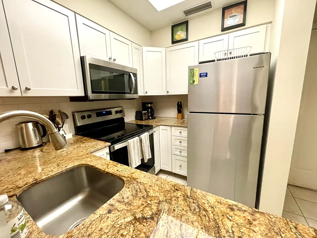 The master suite features a king-size bed, flat-screen TV, and en suite bathroom, while the guest bedroom has two twin beds and an adjacent bath. Cook in the modern kitchen or relax in the open-concept living area with stylish coastal furnishings.